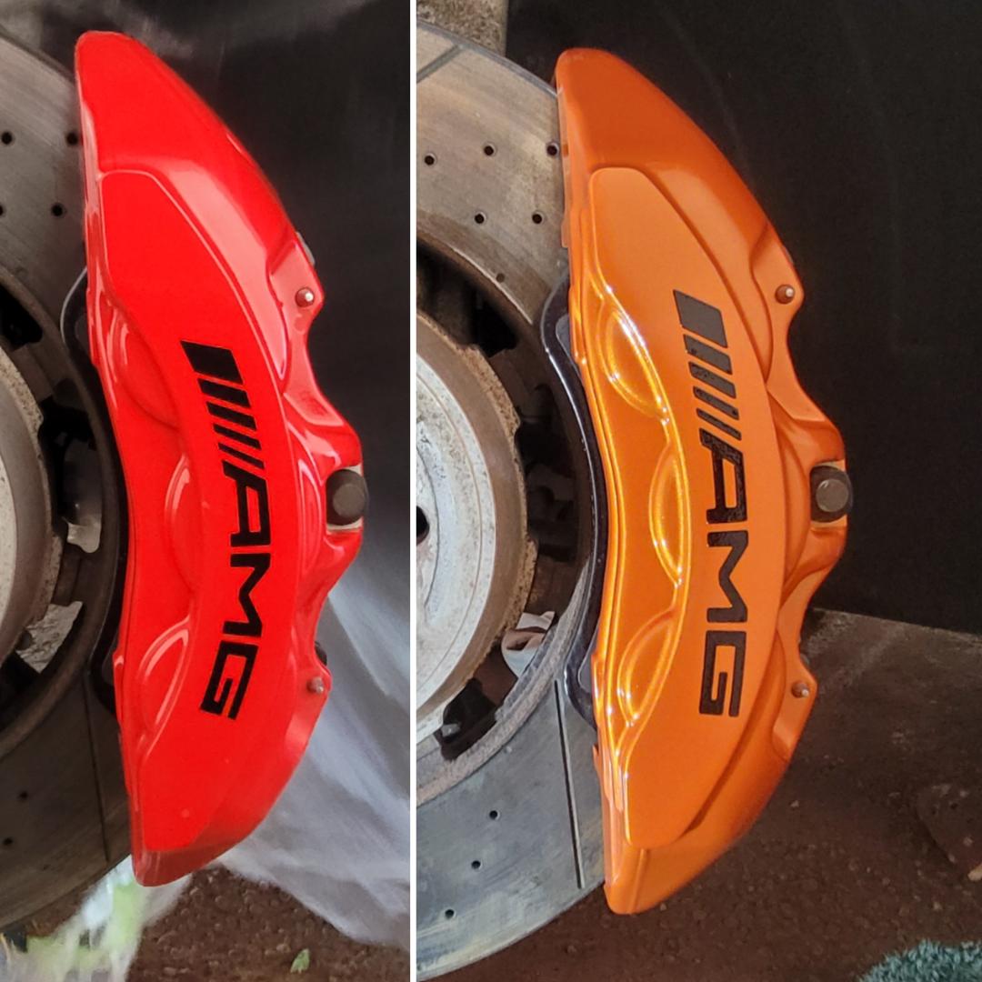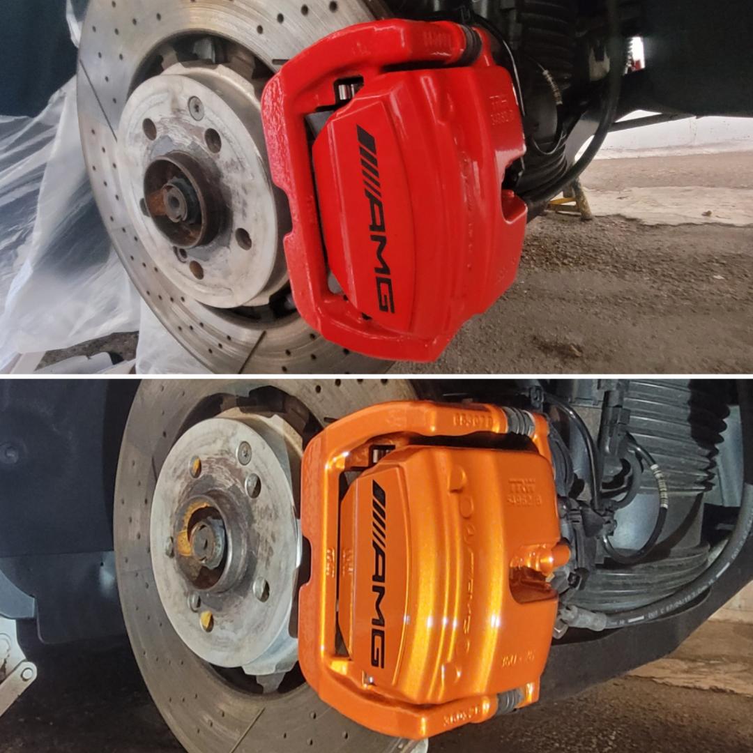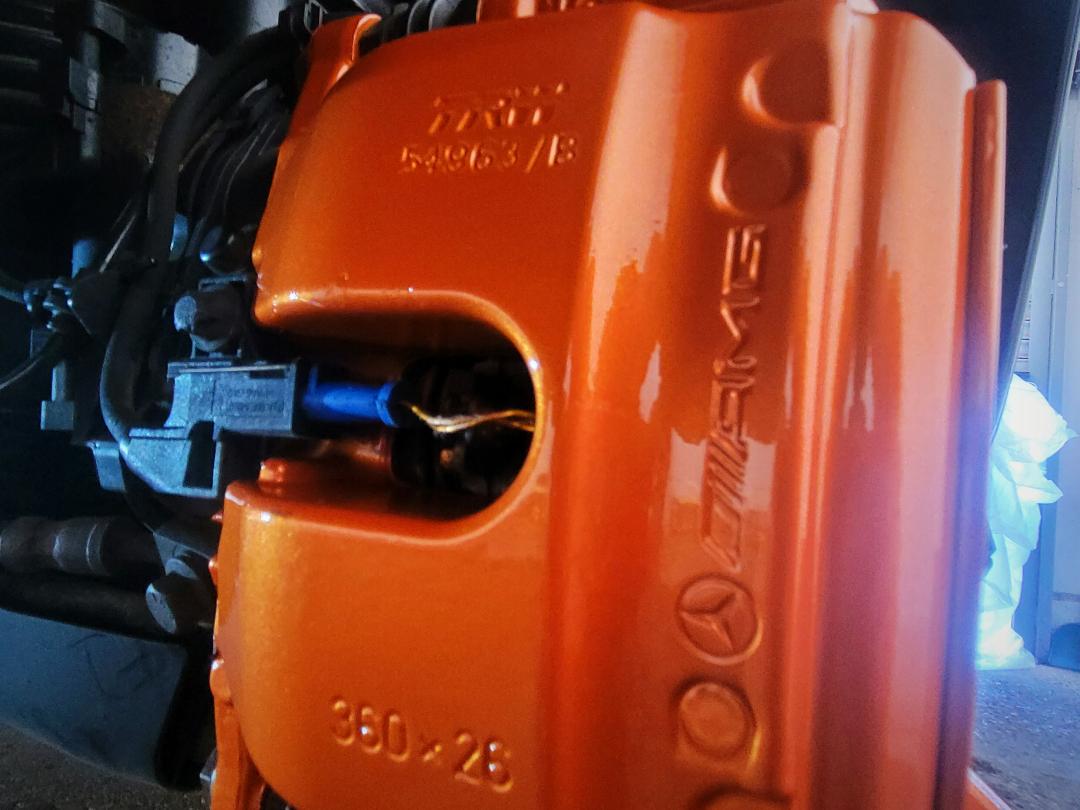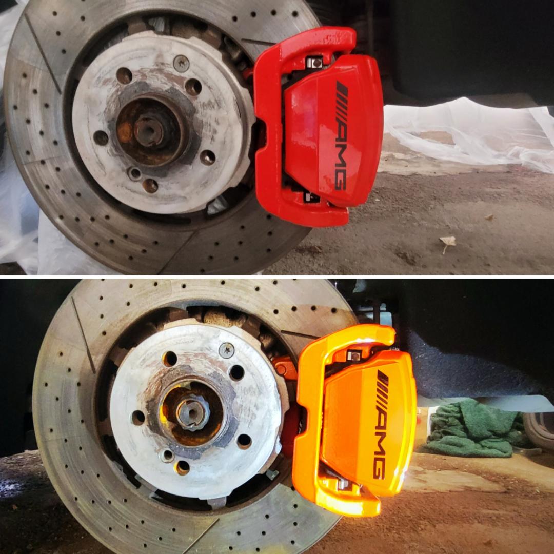Mercedes E63s AMG Brake calipers refurbished from standard Mercedes Red to Lamborghini Orange