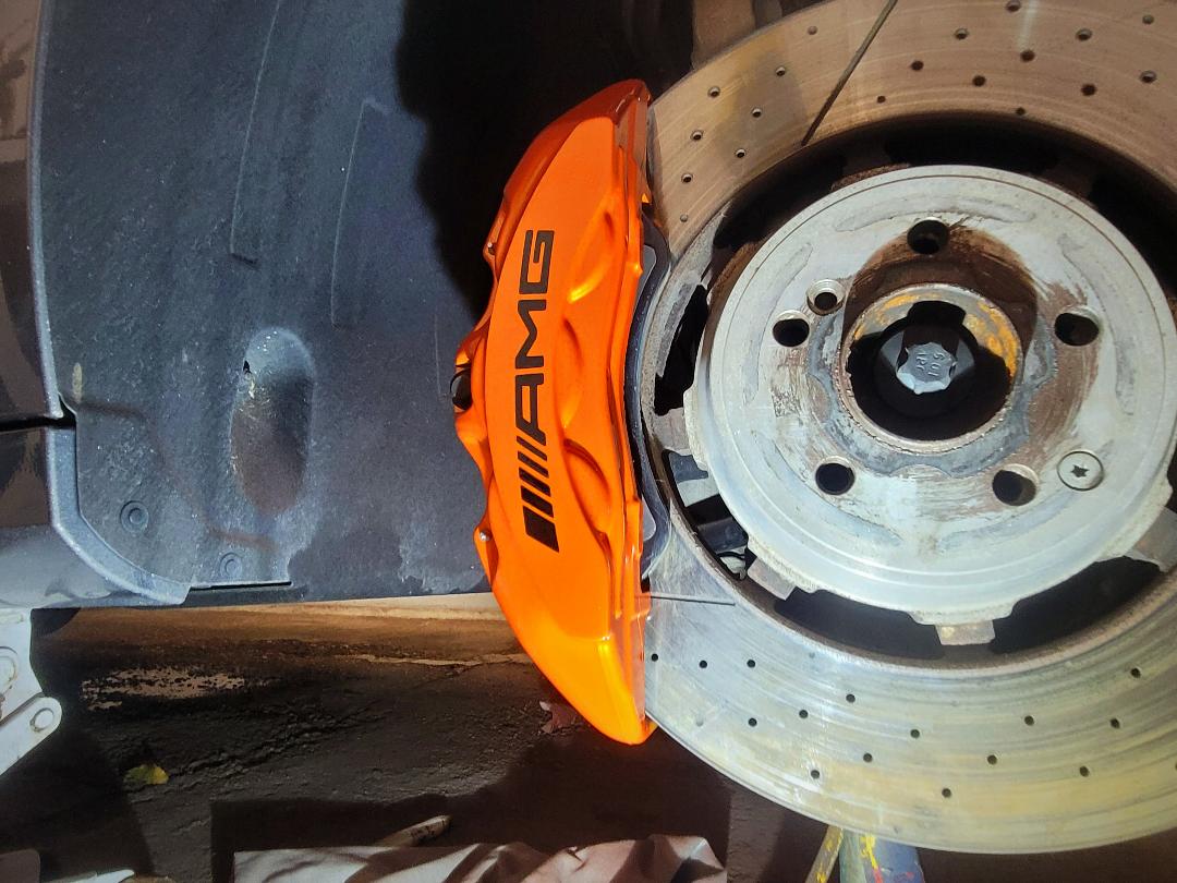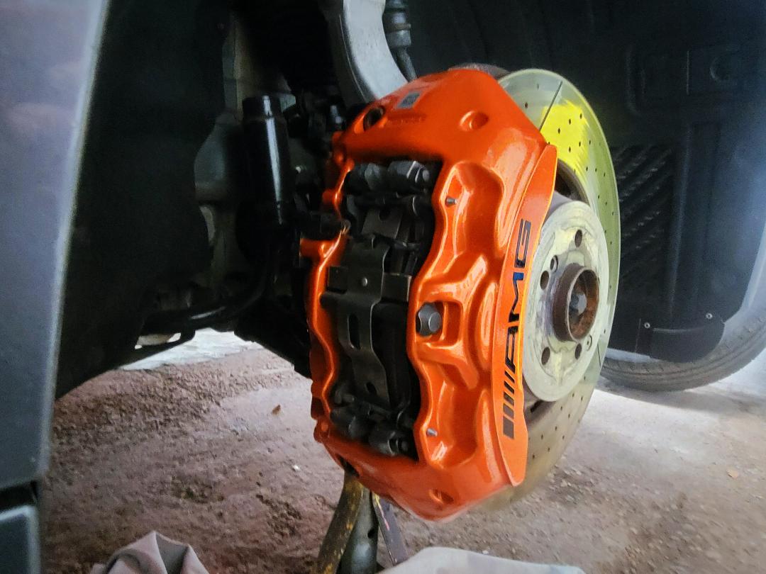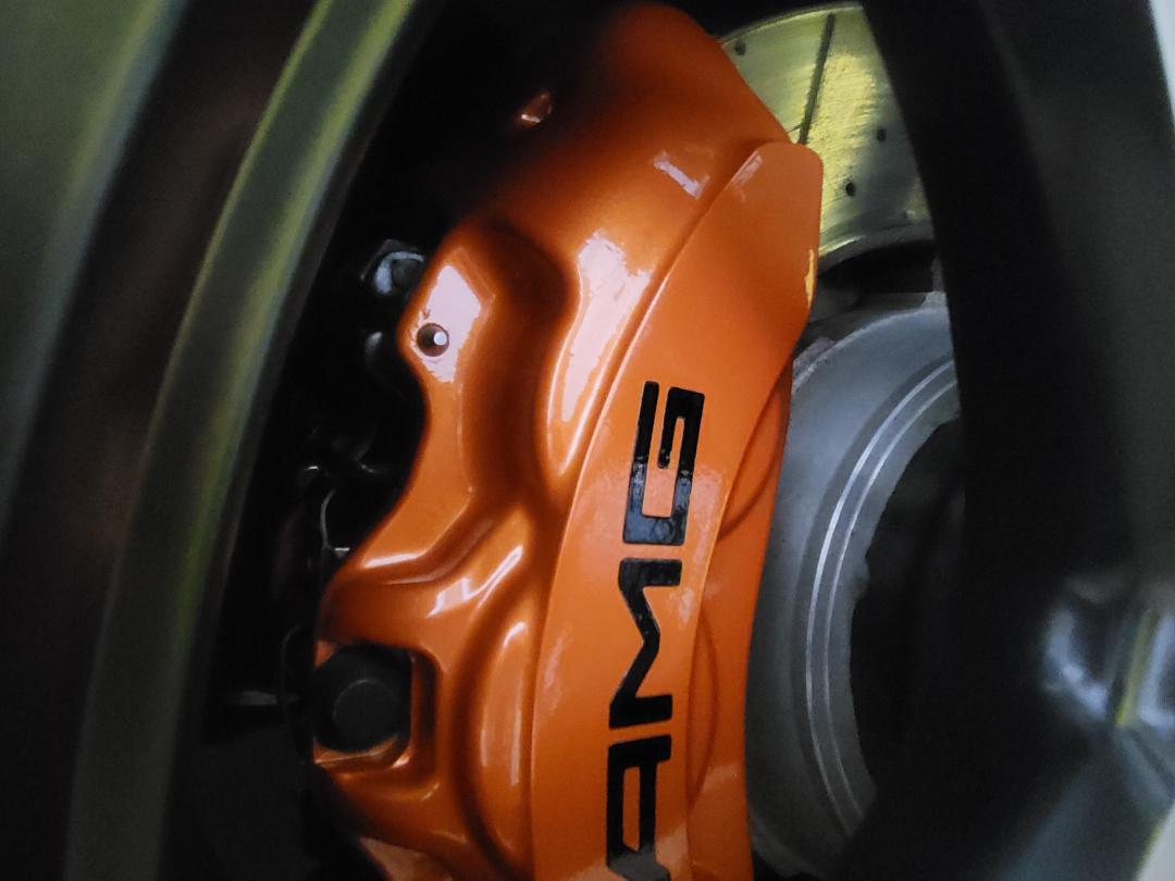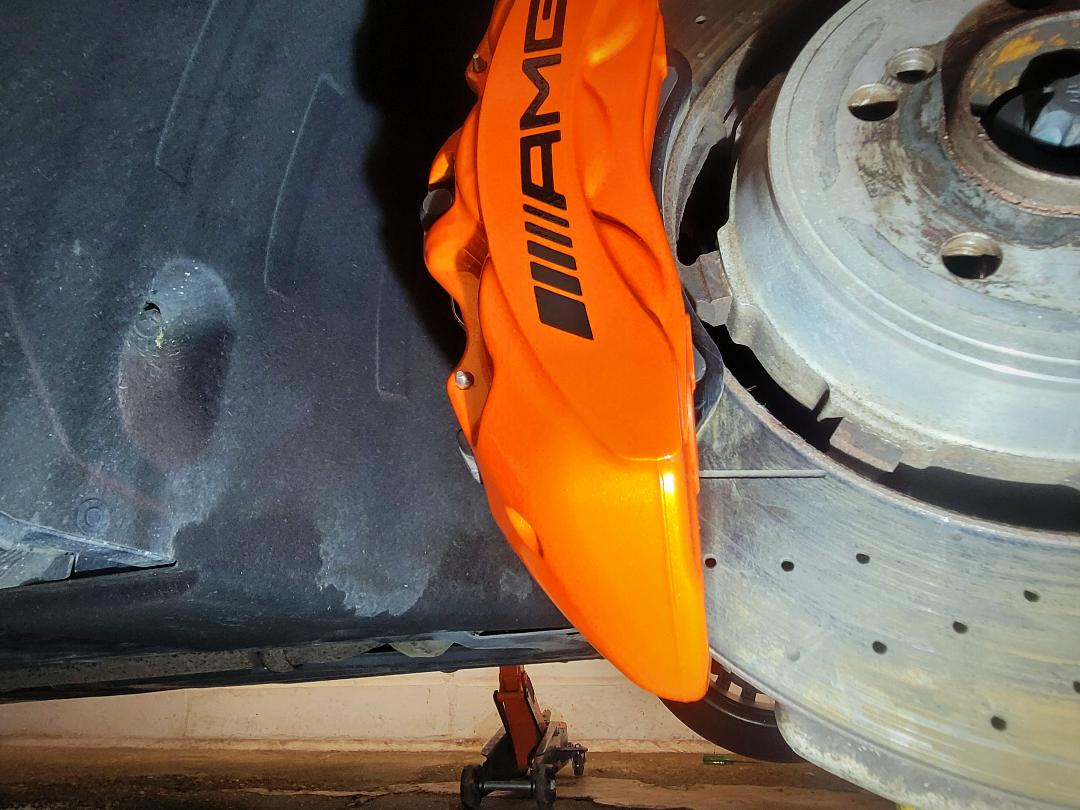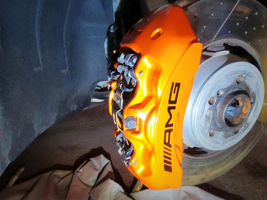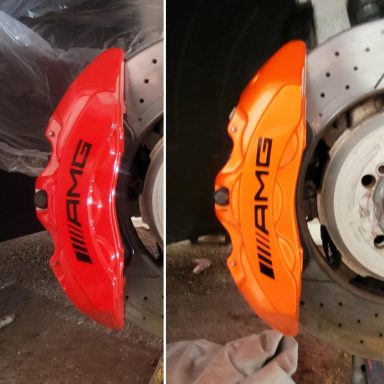 Mercedes E63s AMG Brake calipers refurbished from standard Mercedes Red to Lamborghini Orange