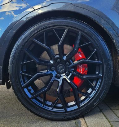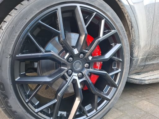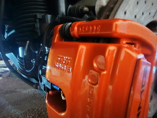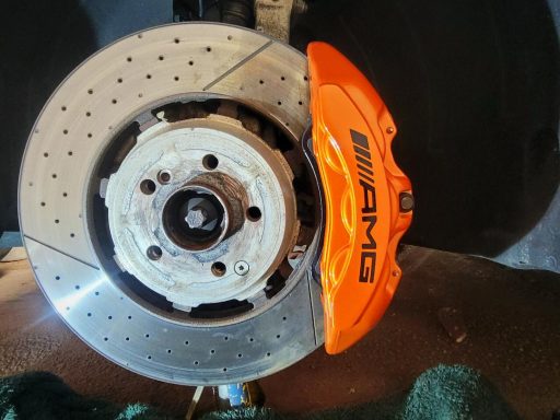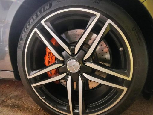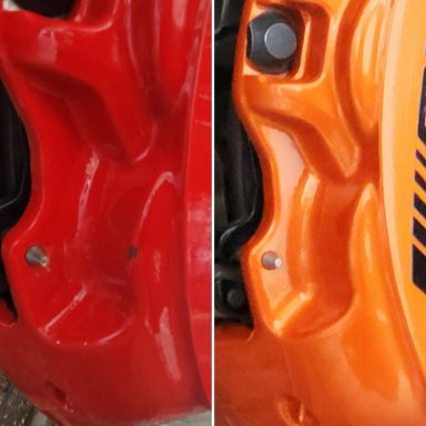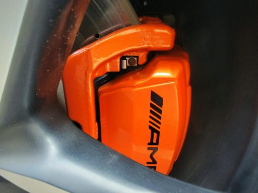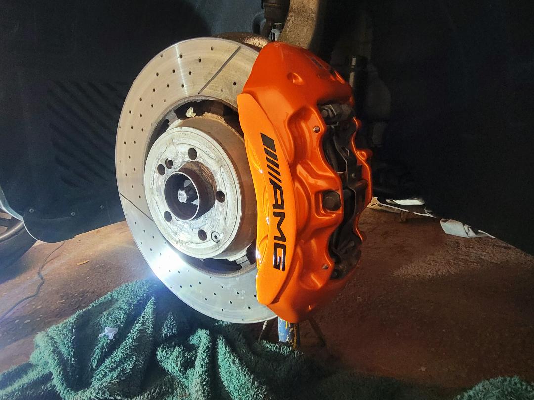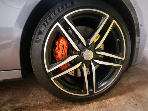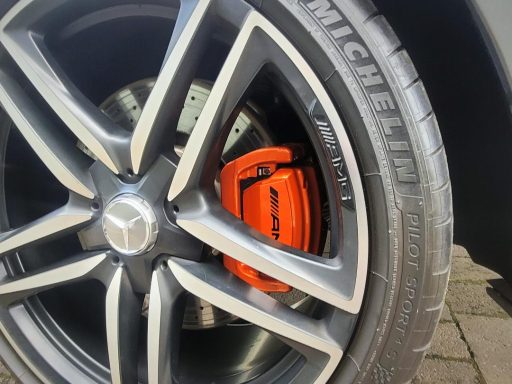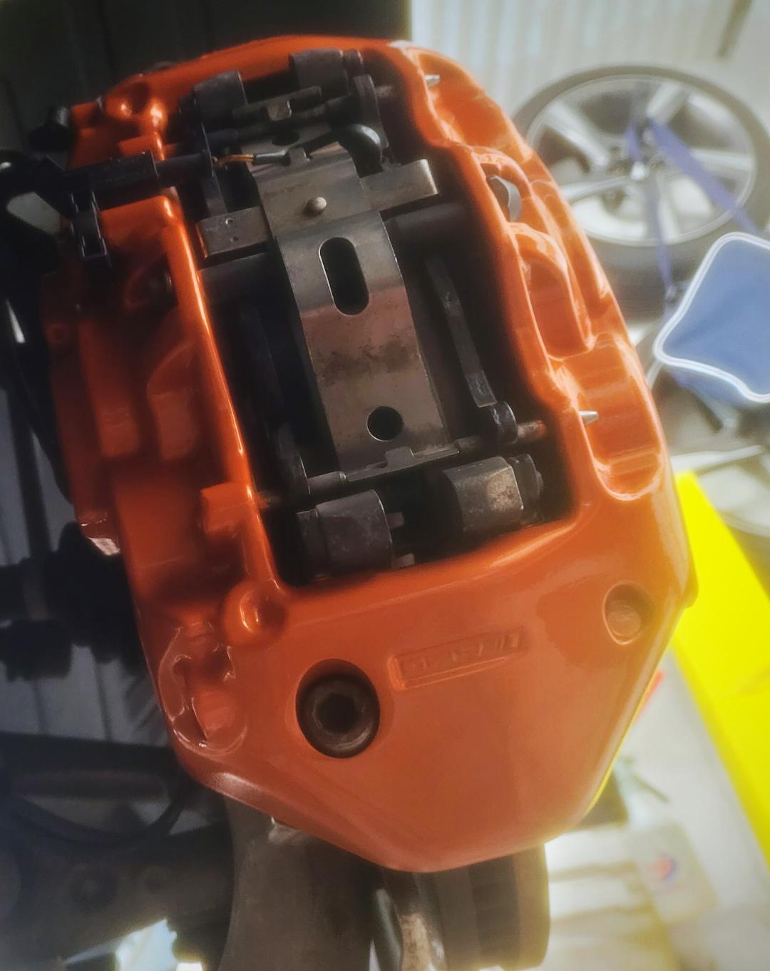 Mercedes E63s AMG Brake calipers refurbished from standard Mercedes Red to Lamborghini Orange